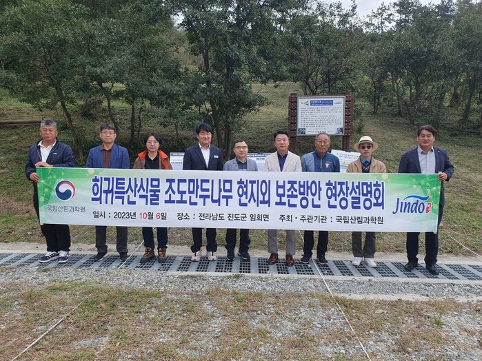 [진도=황승순 기자]진도군이 지난 6일(금), 국립수목원(원장 배재수)과 함께 희귀특산신물 조도만두나무 현지외 보존방안 현장설명회를 실시했다.