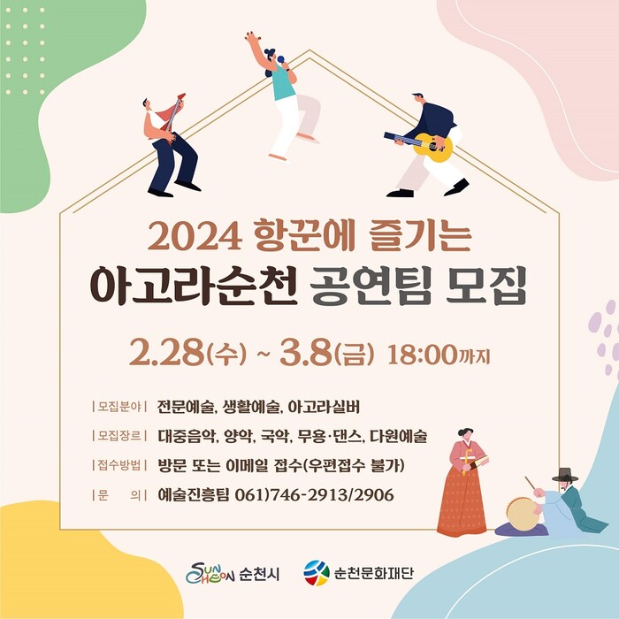[순천=이문석 기자] (재)순천문화재단이 오는 28일부터 3월8일까지 ‘2024 항꾼에 즐기는 아고라 순천(이하 아고라 순천)’ 문화예술 공연팀을 공개 모집한다고 밝혔다.