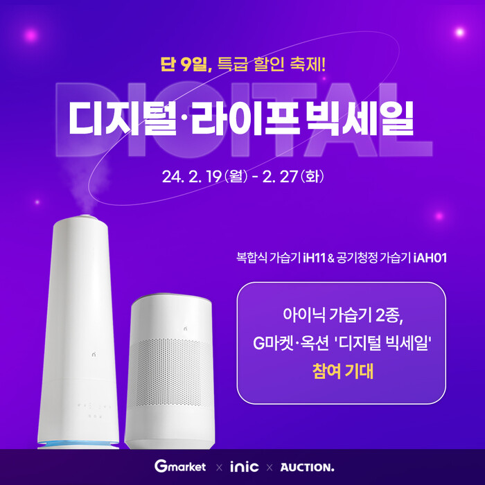 한편, 아이닉 가습기 2종은 오는 27일(화) 자정까지 G마켓·옥션에서 진행되는 ‘디지털 라이프 빅세일’에서 최대 59%까지 할인된 가격으로 만나 볼 수 있다. 자세한 내용은 G마켓과 옥션 제품 페이지에서 확인할 수 있다.