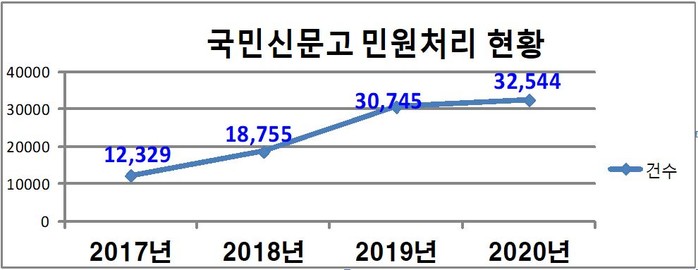 국민신문고는 조선의 신문고 제도를 모티브로 삼아 마련한 통합형 온라인 공공민원창구로서 국민의 생각을 정책으로 실현하고 있으며, 생활 속 다양한 민원 불편 사항에 대한 요구가 가능함에 따라 2017년 12,329건, 2018년 18,755건, 2019년 30,745건, 2020년 32,544건 등 이용하는 민원이 매년 증가추세에 있다.