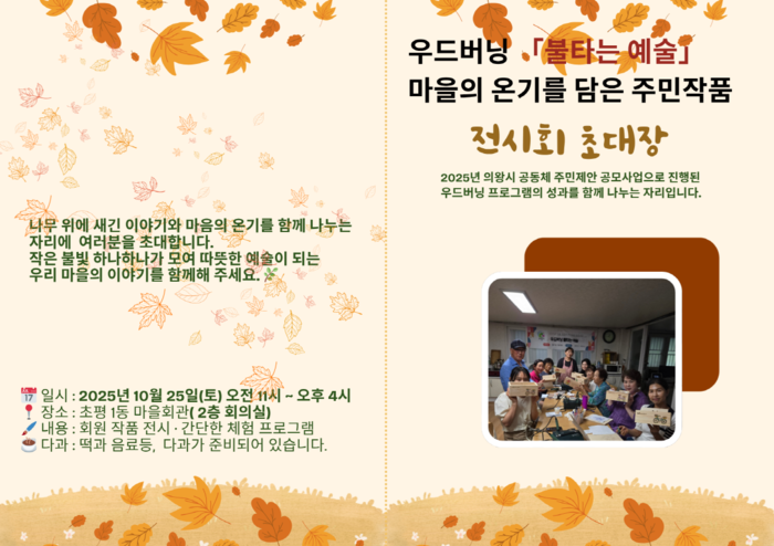 2025년 마을공동체 주민제안사업 지원으로 열리는 이번 작품전시회에서는 회원들의 그간의 노력과 성취가 담긴 우드버닝 작품 약 50점을 선보이며, 회원들이 직접 지도하는 키링 만들기, 가방걸이 만들기 등 우드버닝 체험프로그램도 함께 진행될 예정이다.