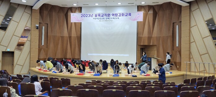 이번 교육은 보육교직원이 정기적으로 받아야 되는 의무교육으로 ▶어린이 안전 이론교육 ▶응급처치 및 심폐소생술 실습교육 ▶장애인식 개선교육 등 어린이 안전사고를 예방하고 대처할 수 있는 방법과 어린이집 내 응급상황 발생 시 신속한 응급처치 방법, 장애에 대한 인식개선내용으로 진행되었다. 또한 안전사고를 사전에 예방하는데 있어 보육교직원 역할의 중요성을 강조하는 시간이 되었다.
