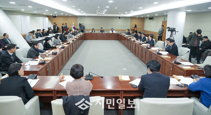 | ▲ 강기정 광주광역시장이 6일 오전 광주시의회 대회의실에서 시의원들과 광주·전남 행정통합 관련 간담회를 갖고 행정통합 추진사항을 논의하고 있다./광주광역시 제공 |