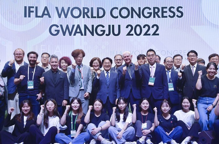 [광주=정찬남 기자] 강기정 광주광역시장이 지난 2일 오후 서구 김대중컨벤션센터에서 열린 '제58차 세계조경가대회 폐막식'에 참석해 제임스 헤이터(James Hayter) 세계조경가협회(IFLA) 회장, 조경진 조직위원장, 세계 각국 조경가협회 대표들과 기념촬영을 하고 있다./광주광역시 제공