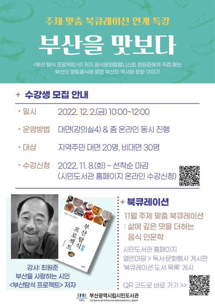 이날 강의에는 온ㆍ오프라인 함께 진행하며, 주제 도서 ‘부산 탐식 프로젝트’의 최원준 작가가 강사로 나와 부산 향토 음식에 담긴 부산의 문화, 역사, 정체성에 대해 알려주고 질의응답 시간도 갖는다.