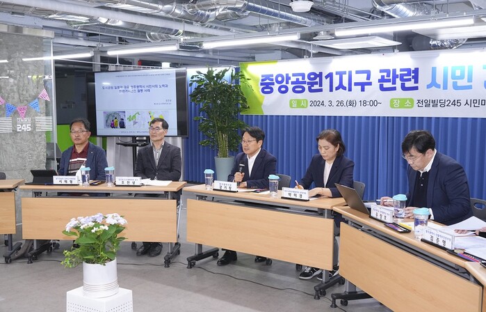 | ▲ 강기정 광주광역시장(가운데)이 지난 3월26일 전일빌딩245에서 열린 ‘중앙공원1지구 관련 시민공청회’에서 시민단체와 끝장토론을 하고 있다. /광주광역시 제공 |