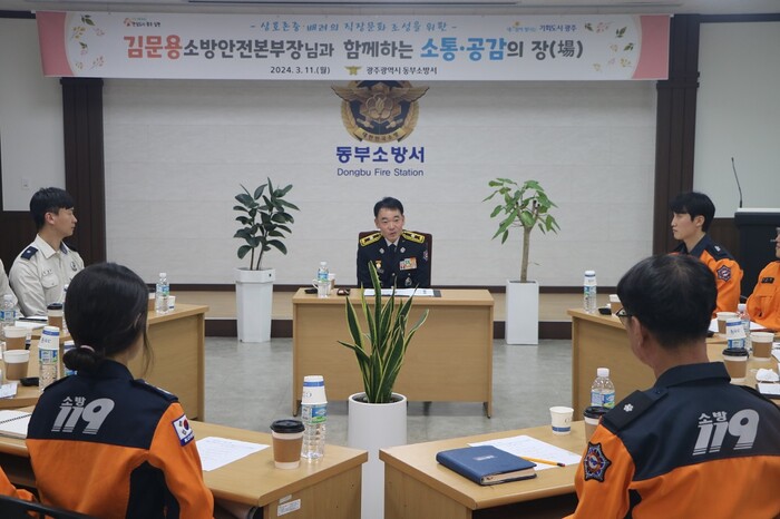 | ▲ 김문용 광주광역시소방안전본부장이 11일 동부소방서를 방문해 직원들과 소통·공감의 시간을 갖고 있다. / 광주광역시 제공 |