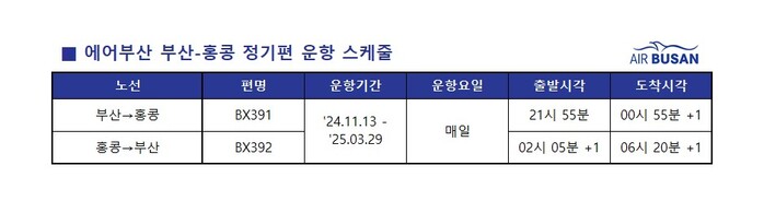 에어부산은 2011년 5월 부산-홍콩 노선에 신규 취항했다. 당시 국내 양대 FSC 두 곳이 양분해왔던 구도 속에 신규 진입해 빠르게 여객 수요를 흡수해간 에어부산은 2014년 해당 노선 여객 점유율 1위에 올라섰다. 타 경쟁사들이 노선 철수를 이어간 가운데에도 지역민들의 교통 편익을 위해 해당 노선 운항을 끝까지 이어 온 에어부산은 코로나19로 운항을 중단할 수밖에 없었던 2020년 2월을 기점으로 4년 9개월여 만에 노선 복원을 이루게 되었다.