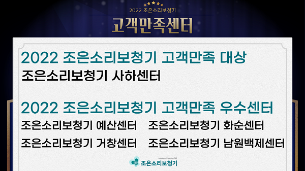 고객만족 대상에는 조은소리보청기 사하센터(대표 김충섭)가 수상의 영광을 안았으며 우수센터에는 조은소리보청기 예산센터, 화순센터, 거창센터, 남원백제센터가 선정되었다.