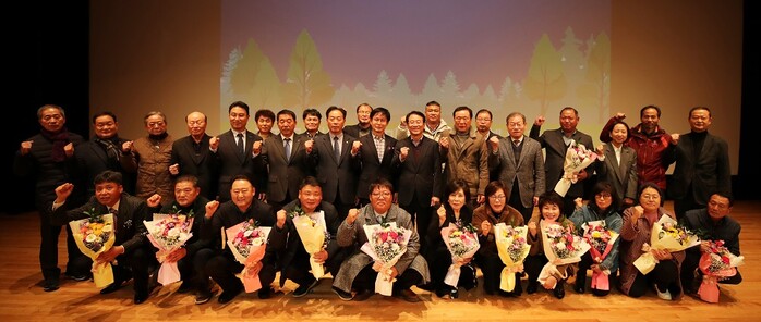 | ▲ 강진원 강진군수(오른 쪽부터 7번 째)가 지난 28일 강진군 강진아트홀 대공연장에서 열린 제8회 임업인 한마음대회에 참석해 임업 유공자 시상 후 임업인 관계자 등과 기념촬영 / 강진군 제공 |