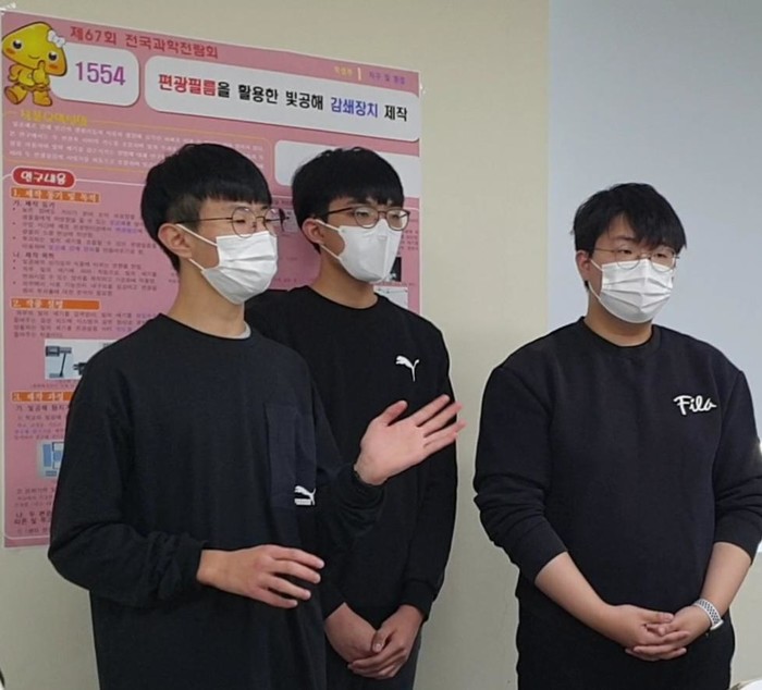 부산광역시창의융합교육원(원장 이연행)은 제67회 전국과학전람회에서 부산과학고등학교 정재민(2년), 주홍성(2년), 이주형(2년) 학생팀이‘편광필름을 활용한 빛 공해 감쇄장치 제작’작품으로 지구 및 환경부문 최우수상을 수상하는 쾌거를 이뤘다고 16일 밝혔다.