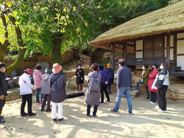 | ▲ 대구시 관계자들이 강진군 푸소체험 벤치마킹을 위해 영랑생가를 방문해 강진군 해설사의 해설을 듣고 있다. / 사진=강진군 제공 |