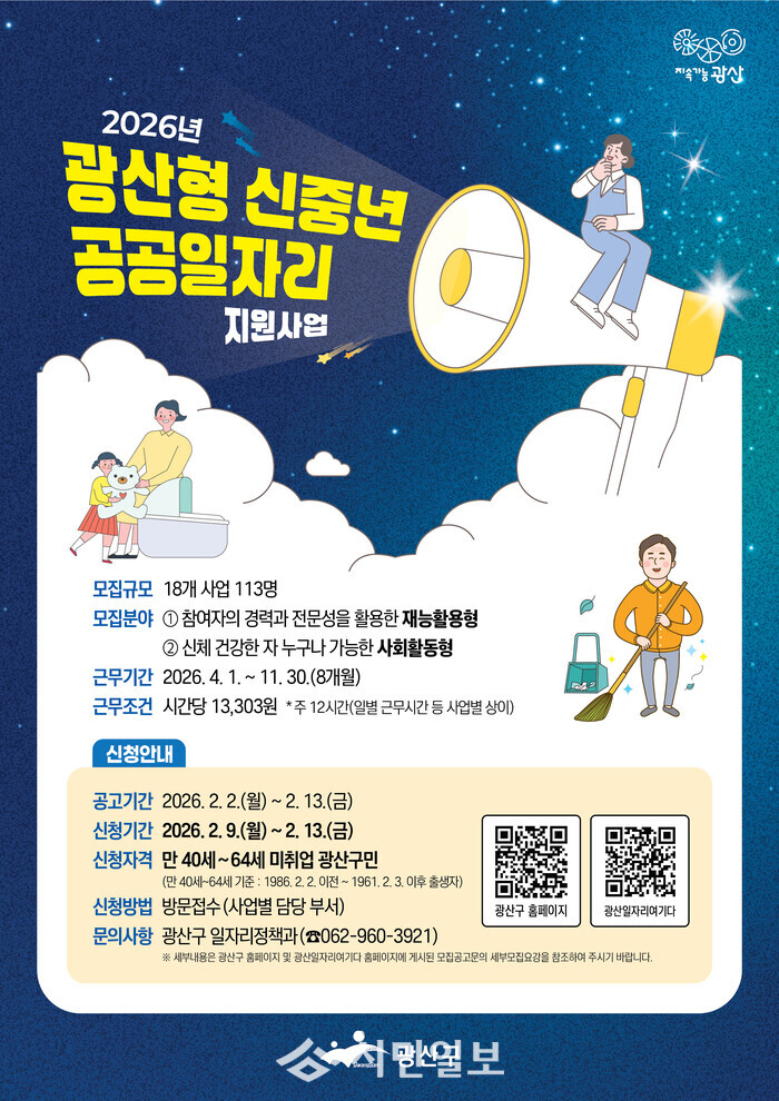 신청 기간은 오는 9일부터 13일까지 각 일자리 담당 부서에 방문하면 되며, 공공일자리 관련한 자세한 사항은 광산구 누리집이나 광산구 일자리 통합플랫폼(광산 일자리 여기다) 누리집에서 확인할 수 있다.