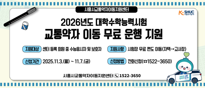 [시흥=송윤근 기자] 경기 시흥도시공사(사장 유병욱, 이하 공사) 교통약자이동지원센터는 2026학년도 대학수학능력시험을 앞두고 ‘수능 날 교통약자 차량 무료 지원 서비스’를 운영한다고 밝혔다.