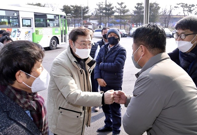 [광주=정찬남 기자] 이용섭 광주광역시장은 설 명절을 맞아 지난 1일 오후 북구 첨단공영차고지를 방문해 시내버스 운수종사자들을 격려하며 철저한 방역과 시민들에게 안전하고 편리한 교통서비스 제공을 당부했다./광주광역시 제공