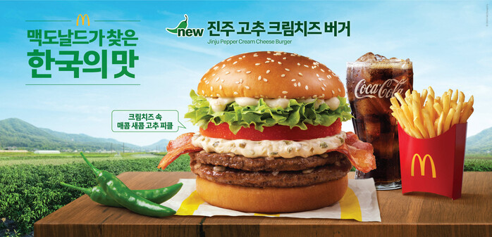 ‘진주 고추 크림치즈 버거’는 맥도날드가 새로운 한국의 맛 프로젝트로 ‘진주고추’를 선택해 탄생했다. 일조량이 풍부하고 남강 주변에 조성된 양질의 토양과 맑고 깨끗한 물로 자란 고추를 활용하여 깔끔한 매운맛이 특징이다.