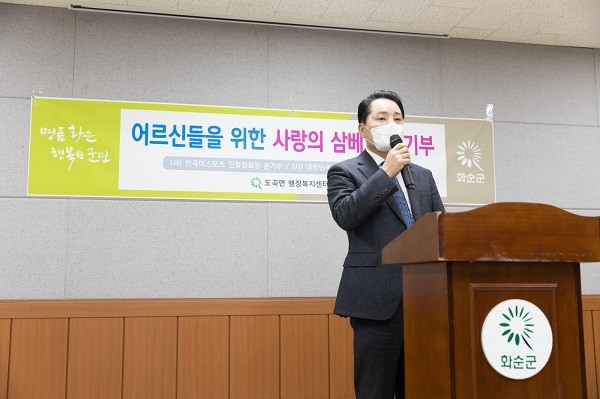 | ▲ 17일 전남 화순군 도곡면 누리관에서 열린 어르신들을 위한 사랑의 삼베·쌀 기탁식에서 ㈔한국e스포츠진흥협회 문기주 총회장이 고향 주민들에게 인사말을 하고 있다. (사진제공=㈔대한민국가족지킴이) |