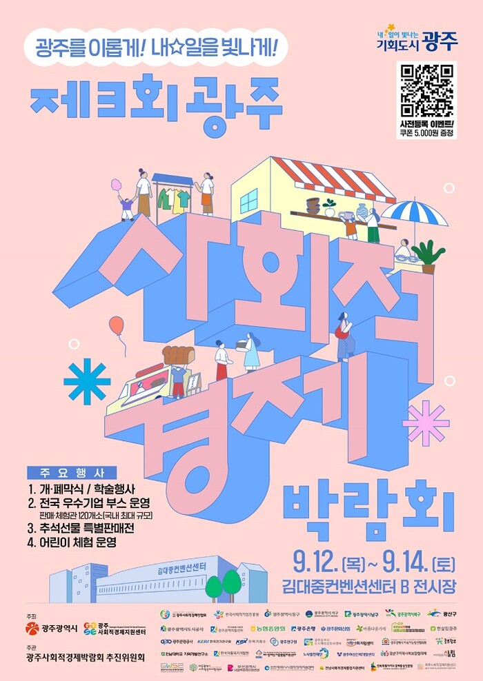 사전 이벤트로 오는 11일까지 광주사회적경제지원센터 누리집을 통해 박람회 홍보이벤트를 진행한다. 사전 등록한 선착순 500명에게 박람회장에서 사용할 수 있는 5000원 쿠폰이 제공된다. 또 사회적경제기업 제품을 5만 원 이상 구매하면 현장에서 사용할 수 있는 5000원 쿠폰을 현장에서 증정하는 이벤트도 열린다.