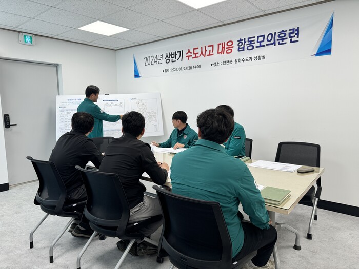 이날 합천군 상하수도과, 한국수자원공사 부산울산경남협력단이 참여한 가운데 합천읍 일대 급수관로 파손 발생에 대비한 도상훈련으로 진행되었으며, 실제 재난 상황 발생 시 효과적으로 대응하기 위해 유관기관 간 신속한 협조로 빠른 시간 내 시설물을 복구하는 훈련이다.
