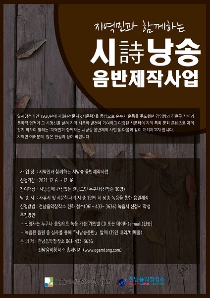 지역민과 함께하는 시낭송 음반제작 사업에 대한 자세한 사항은 전남음악창작소로 문의하면 된다.