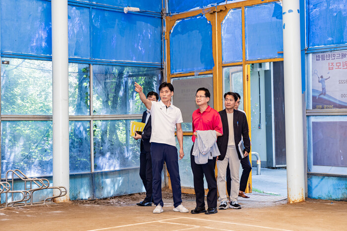| ▲ 당산2동 야외배드민턴장을 방문해 시설 운영 현황을 확인하고 있는 최호권 구청장(가운데)의 모습.(사진=영등포구청 제공) |
