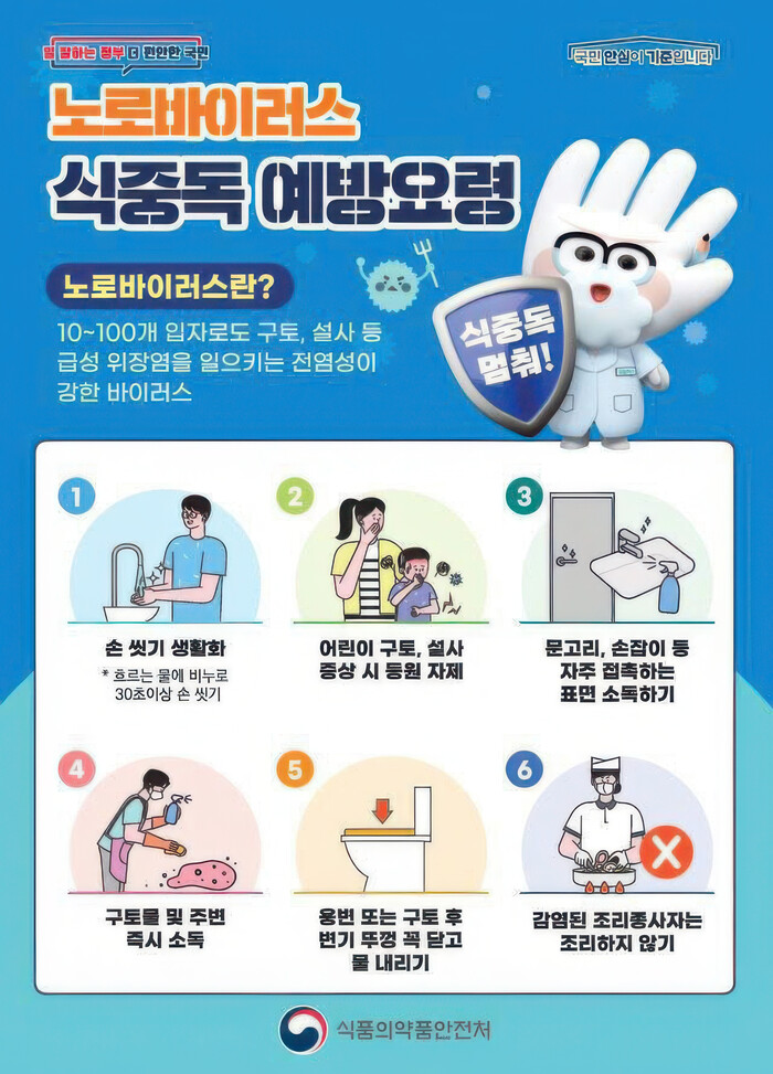 감염 환자의 구토물과 그 주변은 즉시 염소계 소독제를 사용해 소독해야 하며, 감염된 조리 종사자는 조리 업무를 중단하도록 당부했다. 아울러 구토 후에는 변기 뚜껑을 닫고 물을 내리는 것이 감염 확산 방지에 중요하다고 밝혔다.