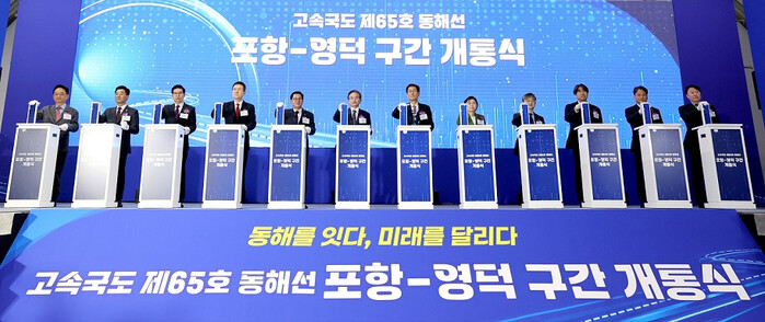 이철우 경상북도지사는 “포항~영덕 고속도로 개통은 동해안권 시대를 여는 신호탄이며, 포항·영덕 등 해양 관광 축을 하나로 연결해 관광권 확장에도 기대가 된다”며 “동해안 고속도로의 마지막 퍼즐인 영덕~삼척, 영일만 횡단구간도 조기에 완성할 수 있게 최선을 다하겠다”고 덧붙였다.