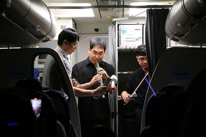 에어부산은 지난 19일 제주-김포 노선의 BX8010편에서 부산지역 장애인 오케스트라를 초청해 기내 연주회를 개최했다. 이번에 초청한 오케스트라는 부산 문화예술단체인 ‘나누기월드’ 소속으로, 발달장애 아티스트인 윤세호 오보이스트와 백인성 바이올리니스트가 함께해 의미를 더했다.