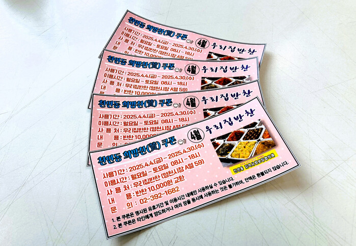 | ▲ ‘서대문구 천연동 지역사회보장협의체’가 관내 취약계층 중장년 1인 가구에 제공하는 반찬 교환 쿠폰(사진=서대문구청 제공) |