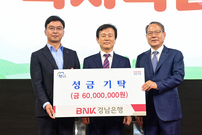BNK(주)경남은행(은행장 예경탁)이 5일 ‘2024 진주복지박람회’에서 지역 내 어려운 이웃을 돕기 위해 성금 6,000만 원을 (재)진주시복지재단(이사장 이성갑)에 기부했다.