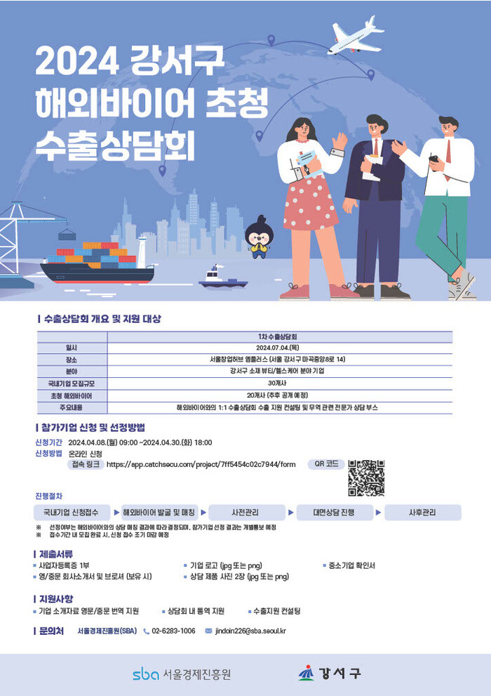 [시민일보 = 변은선 기자] 서울 강서구(구청장 진교훈)는 중소기업의 해외시장 판로개척을 위해 ‘중소기업 수출상담회’를 개최하고 참가기업을 30일까지 모집한다.