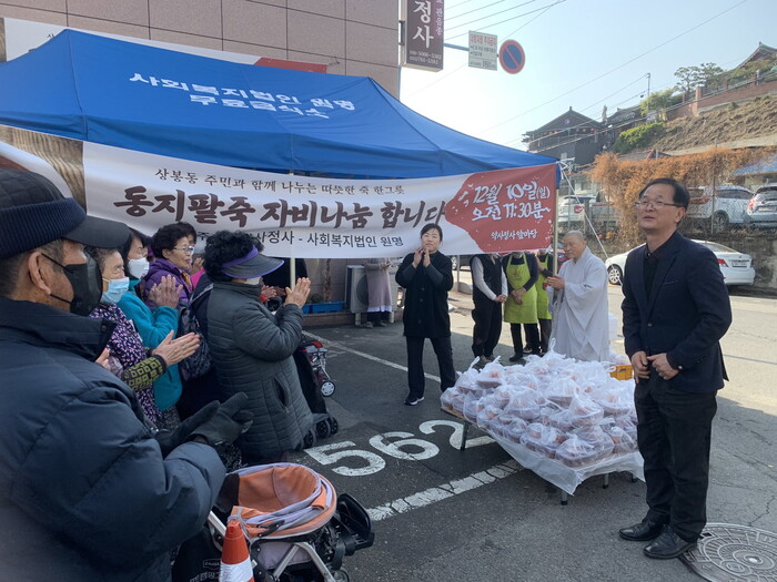 진주 상봉동 약사정사(주지 진여스님)는 10일 신도와 봉사자들이 참여한 가운데 주민 150여 명을 대상으로 동지팥죽 나눔 행사를 개최했다.