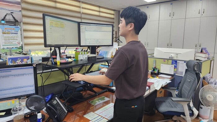 | ▲ 높이조절식 모니터 근무 / 강진군 제공 |