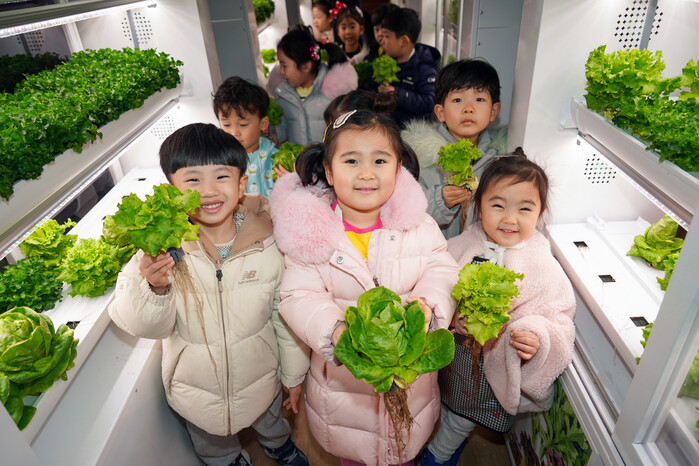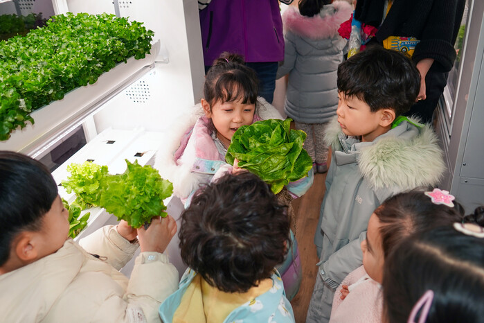 이날 관내 어린이집 아동들은 스마트팜에 대한 설명을 듣고 버터헤드, 이자트릭스, 바타비아 등 샐러드용 채소를 직접 수확하는 체험을 했다.