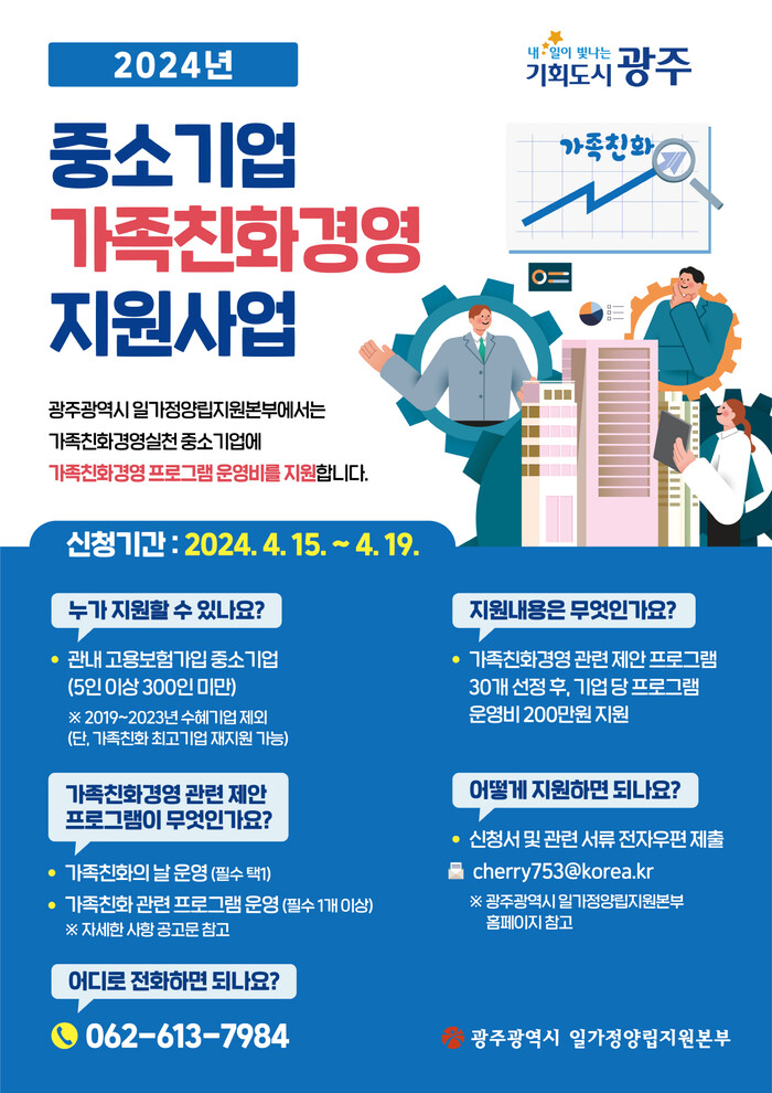 성유석 일가정양립지원본부장은 “광주시는 앞으로도 직원들과 사업주 모두 즐거운 일생활균형과 가족친화적인 기업문화 활성화를 위해 노력할 것”이라며 “올해에도 가족친화경영이 생소하거나 어려운 중소기업들의 많은 참여 바란다.”고 말했다.