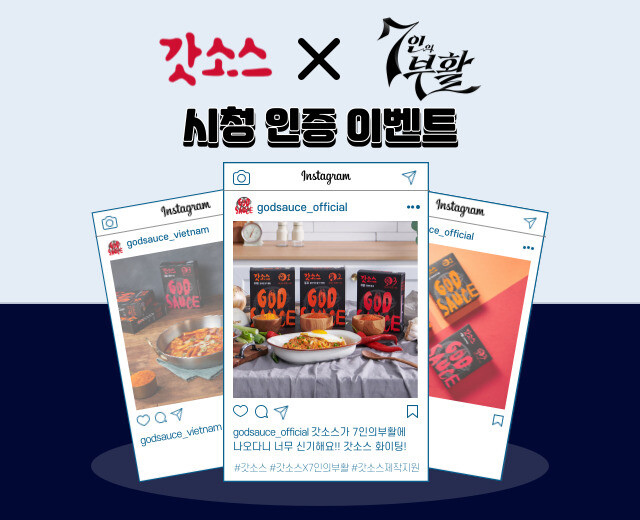 갓소스 관계자는 “‘이번에 드라마 ‘7인의 부활’에 제작지원 하게 됐다. 소비자들에게 갓소스를 알릴 수 있어 기쁘다. 소비자들과 더 활발히 소통하기 위해 다양한 이벤트를 열심히 준비하고 있다. 앞으로 진행될 다른 이벤트에도 참가하셔서 다양한 행운을 잡으셨으면 한다”고 밝혔다.