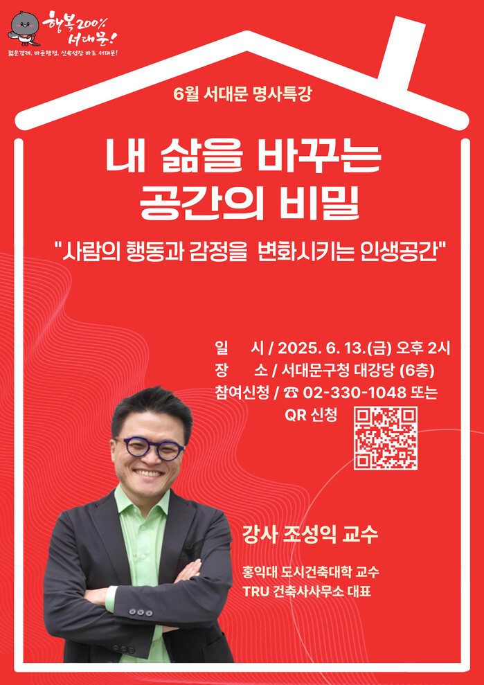 이성헌 서대문구청장은 “이번 특강이 개개인의 공간을 돌아보고 삶의 변화를 그려볼 수 있게 하는 의미 있는 시간이 되길 기대한다”고 말했다.