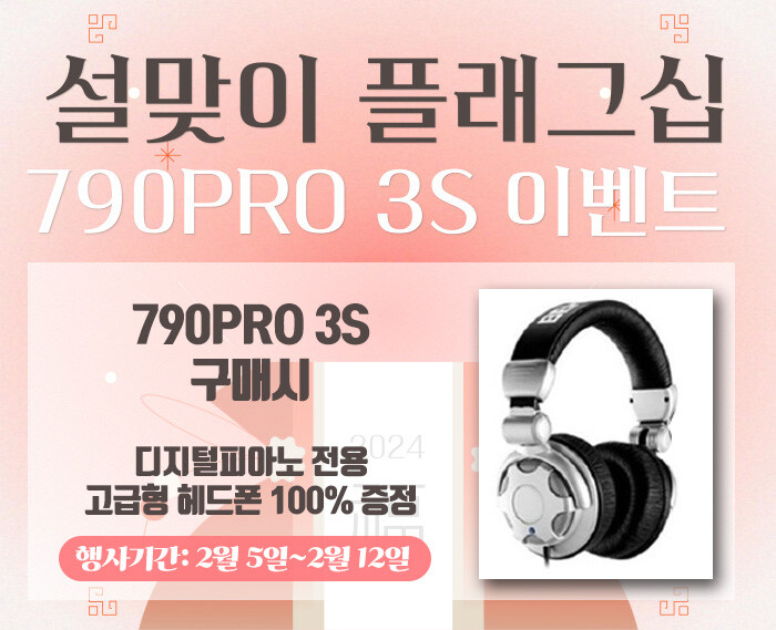 이번 설 특별행사 기간 중 다이나톤의 플래그십 모델 790PRO 3S을 구매한 고객 모두에게 특별 사은품으로 ‘디지털피아노 전용 고급형 헤드폰’을 추가 증정한다. 790PRO 3S는 프리미엄 디지털피아노 중에서도 최고사양 디지털피아노로 다이나톤의 플래그십(대표하는) 모델이라고 할 수 있다. 특히 4Gbit 고용량 사운드뱅크를 탑재한 것이 특징이고 256 동시발음 수를 자랑하며, 블루투스 기능, 음악파일 재생기능, 하프페달 기능 등 다양하고 실용적인 기능이 내장되어 있어 출시 후 많은 인기를 끌고 있다.
