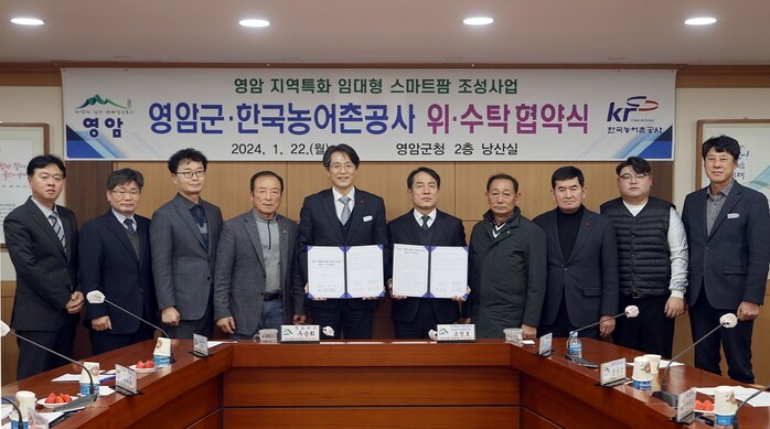 [영암=정찬남 기자] 전남 영암군(군수 우승희)이 지난 22일 군청에서 한국농어촌공사 전남지역본부(본부장 조영호)와 ‘2024년 지역특화 임대형 스마트팜 조성 위·수탁 협약’을 체결했다.