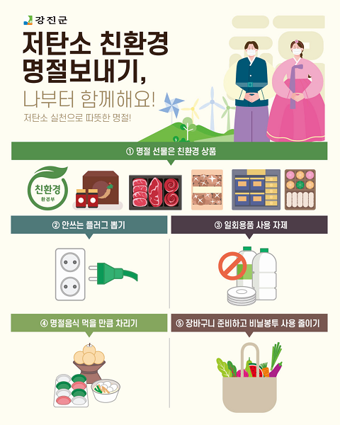 최근 빠른 속도로 온난화 되고 있는 기후위기에 정부는 다양한 분야에서 탄소 줄이기 시책을 제시하고 일상 속에서 저탄소, 탄소중립 실천을 강조하고 있다. 이에 강진군도 정부 정책 방향에 맞춰 저탄소 명절 보내기 캠페인 등 탄소 배출을 줄이기 위해 다양한 방법을 강구하고 추진하고 있다.