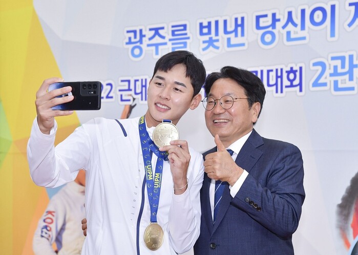 | ▲ 강기정 광주광역시장이 지난해 8월 8일 오전 시청 시민홀에서 열린 ‘2022 근대5종 세계선수권대회 2관왕 전웅태 선수 환영식’에 참석해 전웅태 선수와 셀카를 촬영하고 있다./광주광역시 제공 |