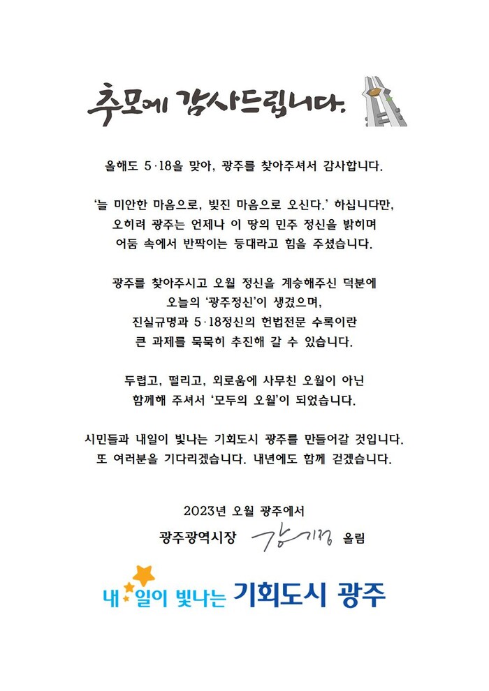강 시장은 지난 2일 전국 각지에서 오월광주를 찾은 학생·개인·단체 등 5·18민주묘지 참배객과 전일빌딩245 방문객, 기념행사를 연 전국시도5·18행사위원회 등에 감사 서한을 보냈다.