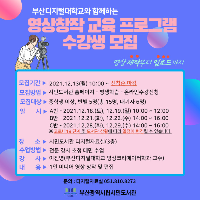 부산광역시립시민도서관(관장 김흥백)은 12월 18일부터 29일까지 3회에 걸쳐 3층 영상창작 공간에서 도서관 이용자를 대상으로 영상창작 교육 프로그램을 운영한다.