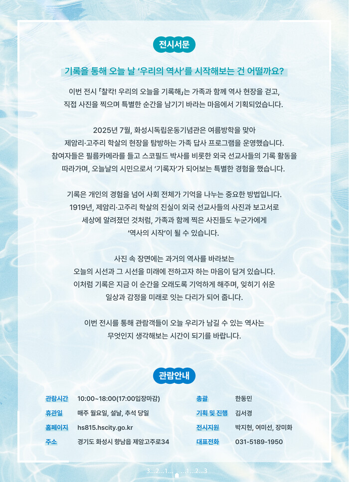 [화성=송윤근 기자] 경기 화성특례시(시장 정명근)가 오는 15일부터 9월 28일까지 화성시독립운동기념관 로비에서 광복 80주년 기념 시민 참여형 사진전 ‘찰칵! 우리의 오늘을 기록해’를 개최한다.