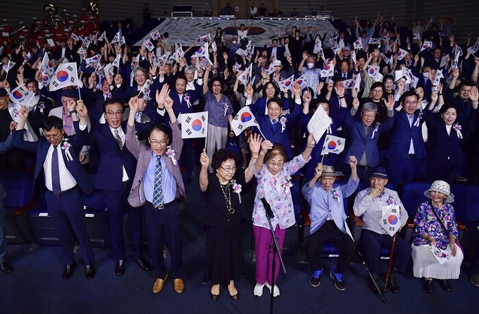 [광주=정찬남 기자] 제78주년 광복절을 맞은 15일 오전 10시50분. 경축식이 열린 광주광역시청 대회의실 가득 만세삼창이 울려퍼졌다. 이번 만세삼창의 선두에는 최만년 애국지사 손자녀인 최장훈 선생, 일제강제동원 피해자 양금덕 할머니, 김범수 독립유공자 손자녀인 김행자 선생이 함께 섰다.