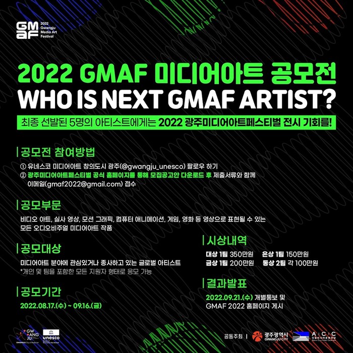 공모전에 최종 선발된 5명에게는 총 900만 원의 상금과 광주미디어아트페스티벌 기간 중 광주시가 보유한 다양한 미디어아트 플랫폼을 활용한 전시 기회가 주어진다.