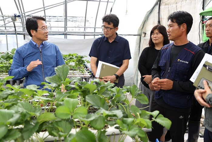 | ▲ 강진원 강진군수가 딸기 육묘장을 찾아 농업인들과 의견을 나누고 있다. / 강진군 제공 |
