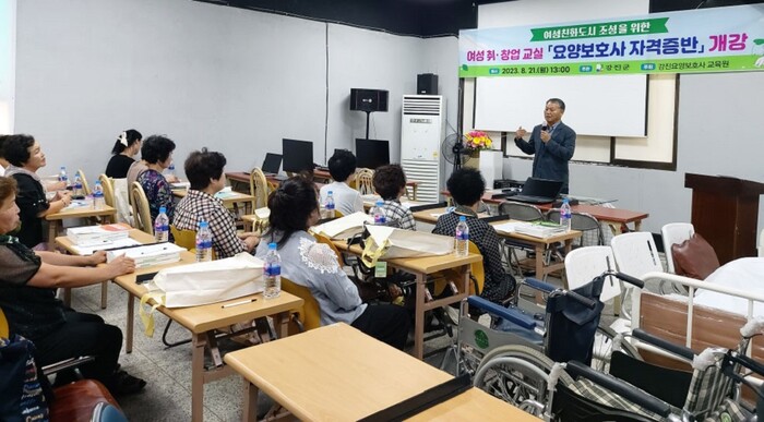 강진군에서 출산·육아·가족 구성원의 돌봄 등으로 경력이 단절된 여성의 직업능력 개발 및 경제활동 촉진을 위해 자격증반 과정 개설을 위한 수요 조사를 실시, 심의를 통해 요양보호사 자격증반이 선정돼 개설했다.
