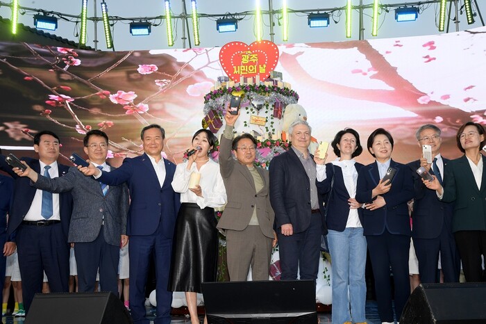 | ▲ 강기정 광주광역시장이 지난 5월 21일 오후 중외공원 일원에서 열린 제59회 광주시민의의 날 행사에 참석하여 참석자들과 함께 축하 세레모니를 하고 있다. /광주광역시 제공 |