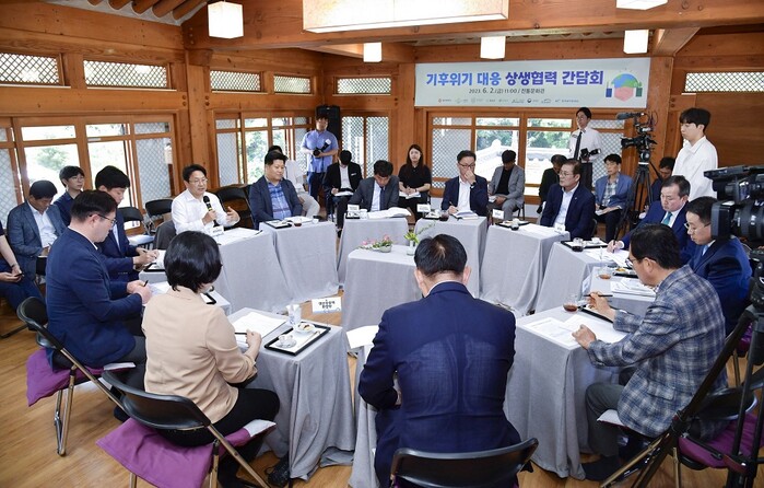 | ▲ 강기정 광주광역시장이 지난 6월 2일 오전 동구 전통문화관에서 열린 '기후위기 대응 상생협력 간담회'에 참석해 광주 인접 5개 시·군 단체장, 관계기관장들과 함께 가뭄관련 중앙부처 공동 건의사업 등을 논의하고 있다./광주광역시 제공 |